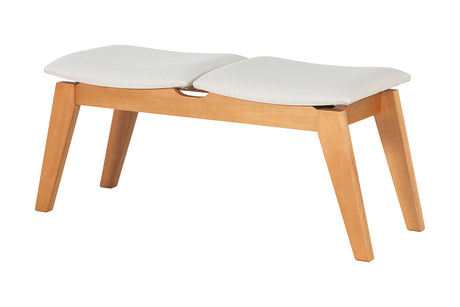 O assento estofado em tecido claro proporciona leveza ao visual e uma experiência agradável ao sentar. A divisão sutil em dois módulos reforça o equilíbrio do design e oferece conforto individualizado, tornando o banco perfeito para o uso diário.
