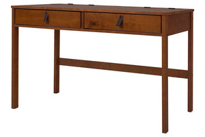 Produzido em madeira de Pinus de floresta plantada com acabamento em tingidor, selador e verniz e puxadores em couro.